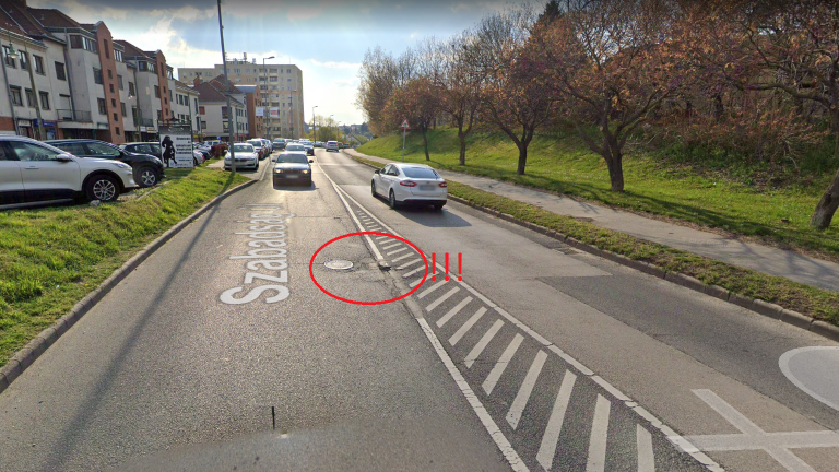 Brutálisan nagy úthiba található a Szabadság út 160 környékén, egy csatornafedél környékén megrongálódott az út, centiméter mély lyuk van a csatornafedél körül!
