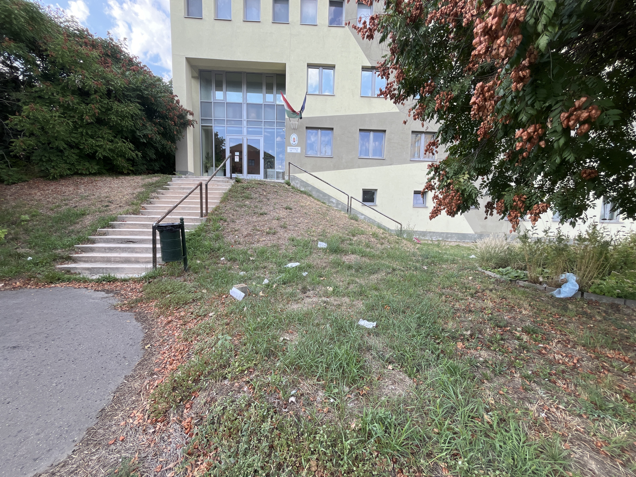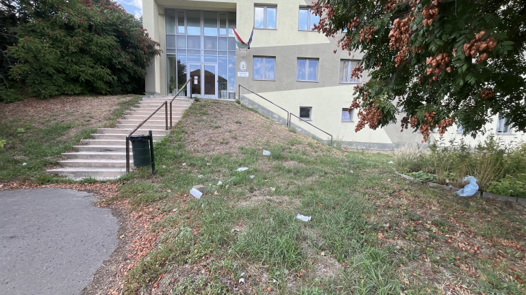 Szétszóródott szemét van a budaörsi járási ügyészség épülete előtt.