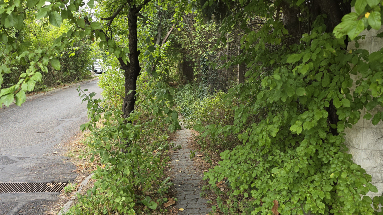 A Bányász u.-ban növényzettel benőtt, elhanyagolt, járhatatlan a járda.