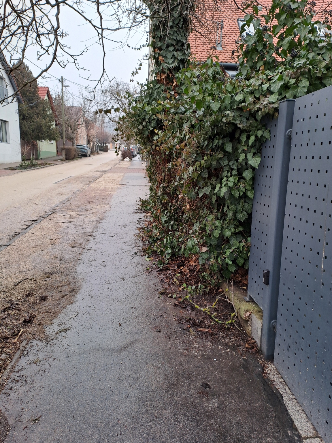 Tavaly már jeleztük, hogy tarthatatlan állapotok uralkodnak a Mátyás Kr. ut 8 sz ház előtt. A hatalmas borostyán tömeg ami már a járdára omlik, teljesen elfoglalja a járda felét. A köz járdán már csak araszolni lehet, vagy letérni a földes útra, de ott meg legtöbbször a tulajdonos autói parkolnak, Tavaly már jeleztük, de azt is hogy csak nagyjából vágták le a borostyánt, ami már annyira megnőtt, hogy visszahajlik, tehát már le is kell hajolnunk. Ez közterület, és kérjük hassanak oda hogy a kerítés széléig takarítsák ki a borostyántól a járdát, és alatta a sok szemetet is takarítsák el.