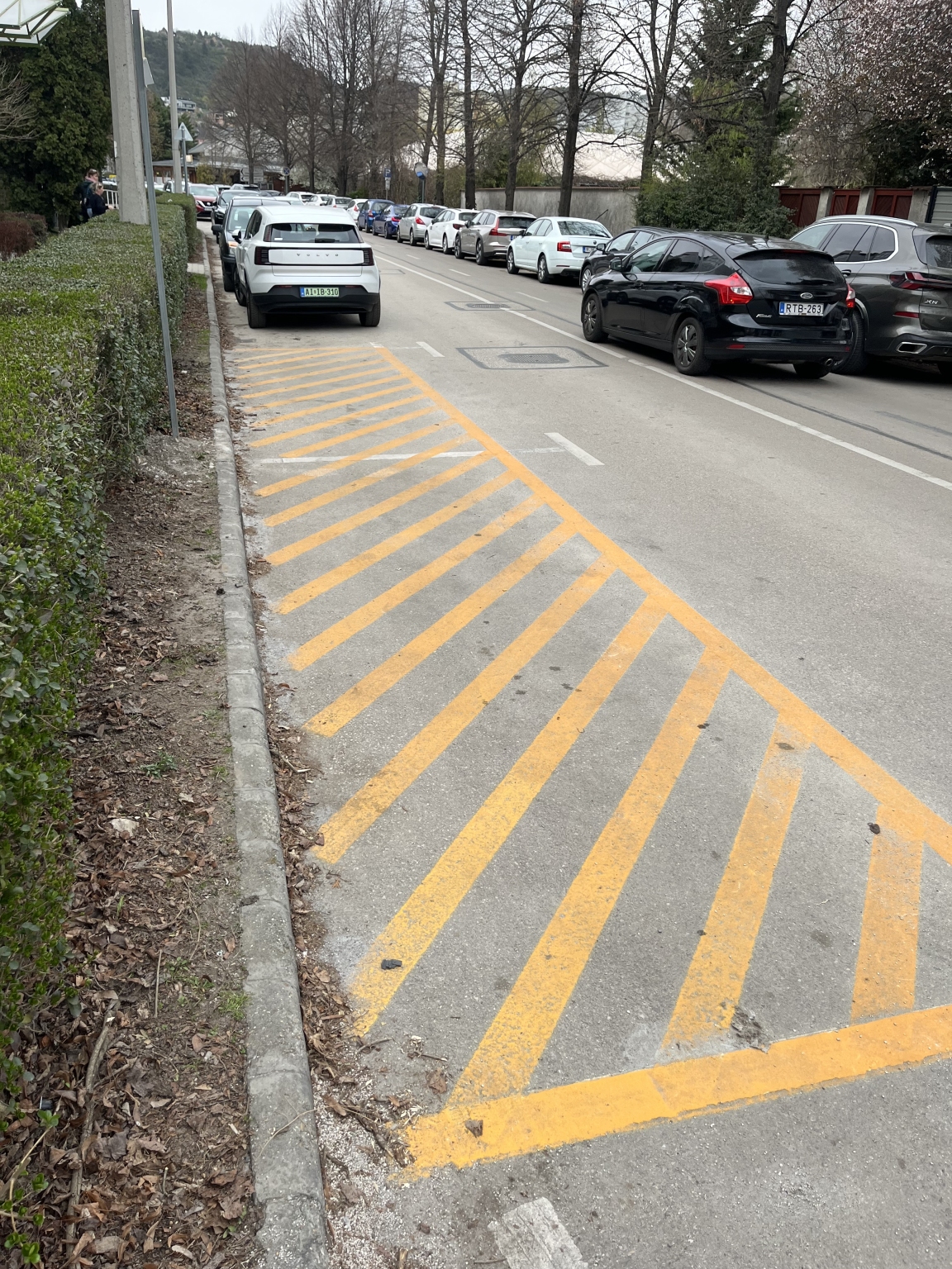 A megjelölt helyen közterületen KRESZ szerint ismeretlen útburkolati felfestés található a parkolóhelyek kijelölt vonalára felfestve