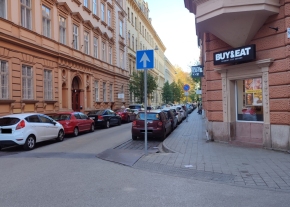 A József körút 81-83 előtt hiányoznak a járdán parkolást megakadályozó oszlopok.