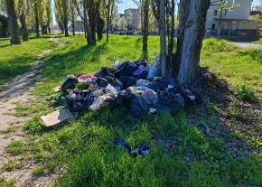 Valaki napokkal ezelőtt egy nagy kupac illegális szemetet pakolt le az üveges szelektív kuka mellé. A szél széthordja az úttestre/járdára.