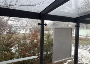 A Kaptárkő utca 6-nál graffiti és kívülről ráragasztott kis plakátok a city light-on.