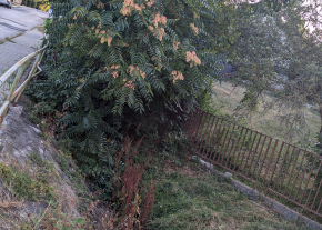 XXII. Pattantyús és Tanító utca sarkán, 150-es buszmegálló mögött a vízelvezető árok szomorú állapotban van. Tele van szeméttel (pl. flakonok, közlekedési tábla!!!!) és gyomfák nőnek már benne, többek között a támfalból is.