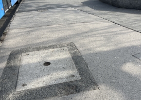 A kapubejáró előtt a a T-com aknafedele megrongálodott, a járda kis részen be is szakadt.