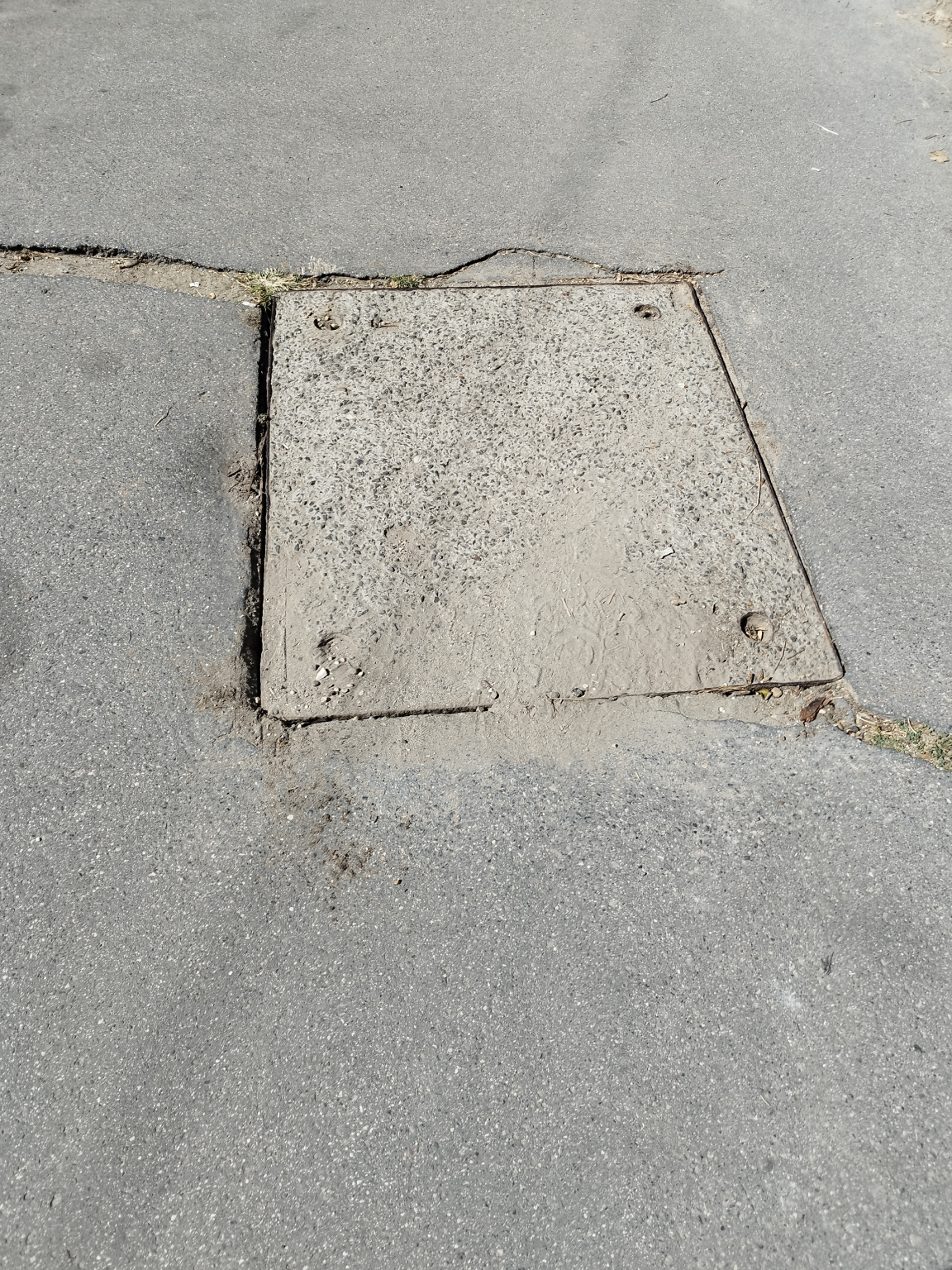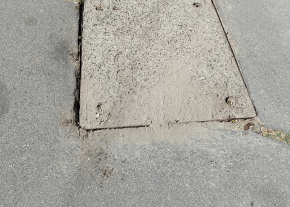 Megsüllyedt fedlap a BAH-csomópont közelében. A járda is keresztben megrepedt körülötte.