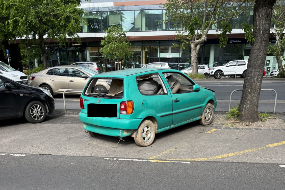 A Váci út és a Csángó utca kereszteződésénél valaki több hete lerakott egy roncs autót.