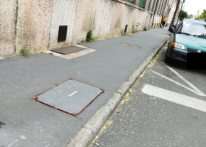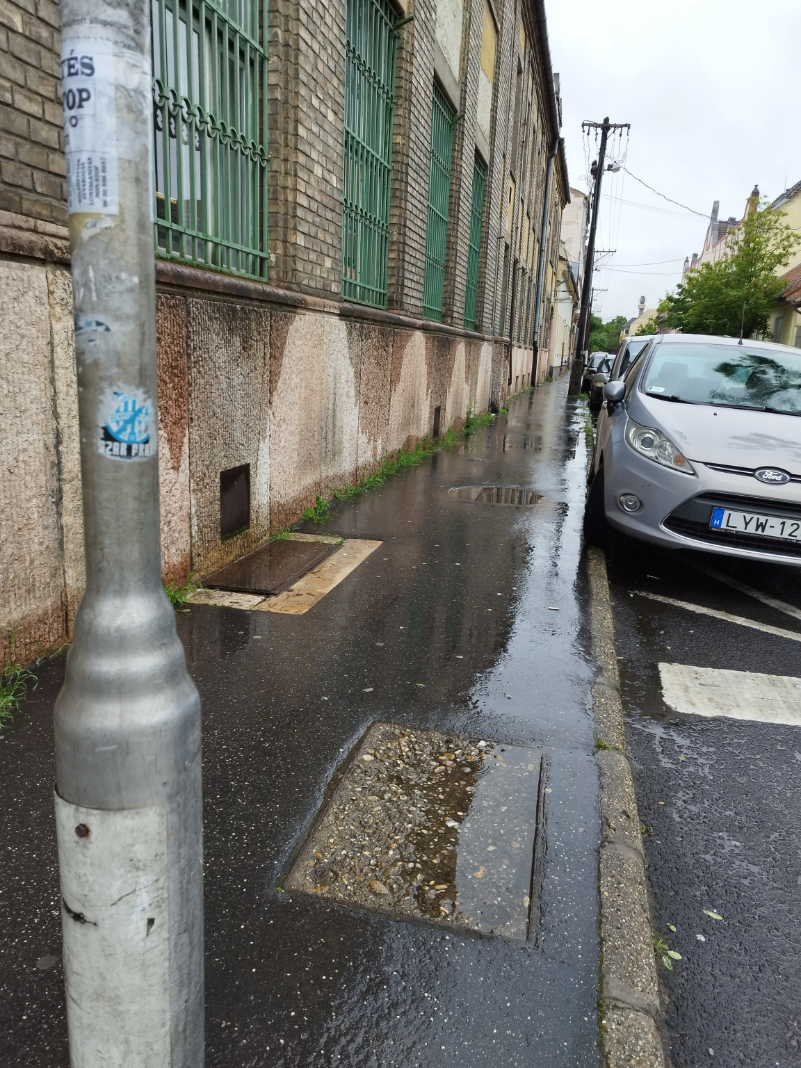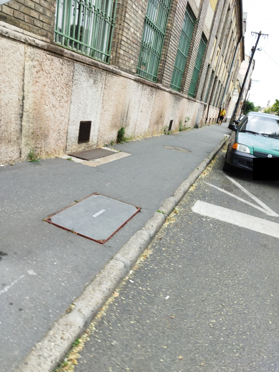 Az István út - Lőrincz utca sarkán lévő kisméretű fedlap megsüllyedt, és kopott.