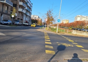 A korábbi, azóta megszűnt autóbuszparkoló bejáratára mutatnak a táblák, amelyek már feleslegesek (kötelező haladási irány busznak, hátsó táblán kötelező haladási irány).