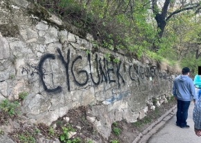 A Vércse utca-Vércse köz sarkánál található Vércse köz utcatábláját összefirkálták.