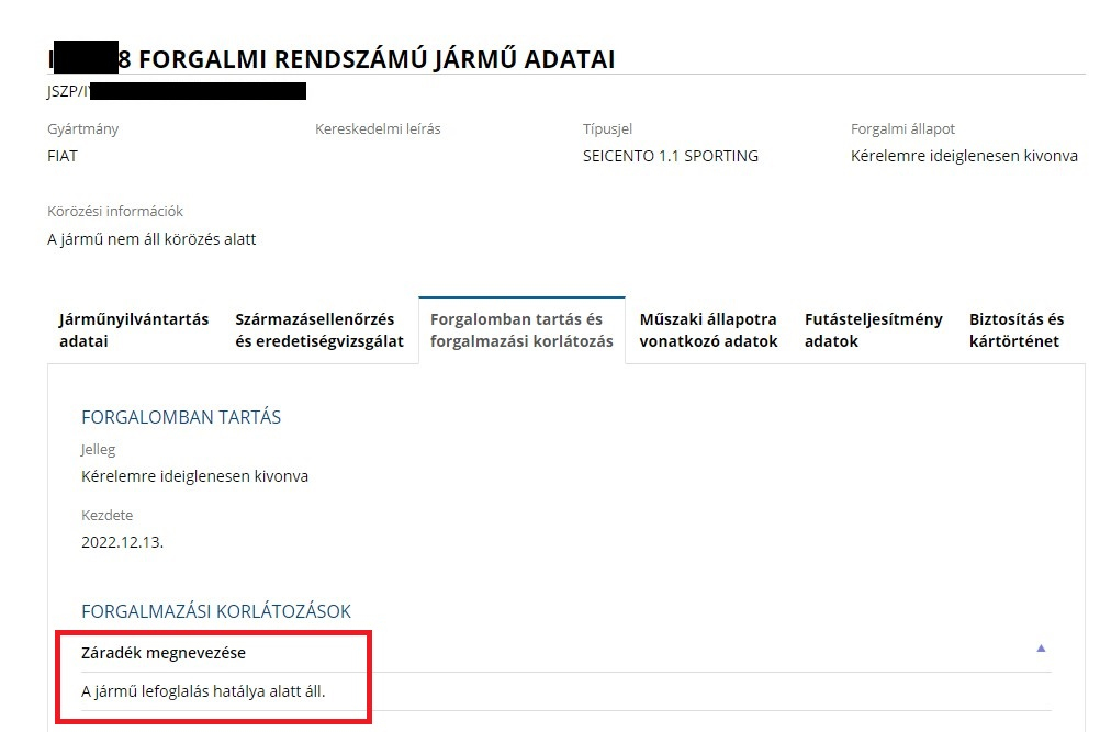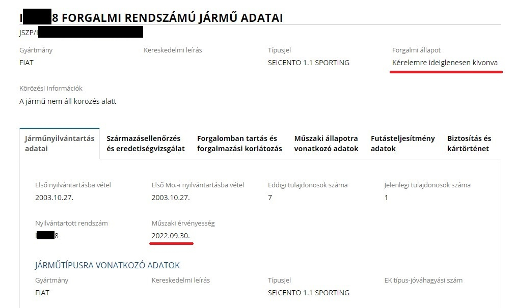 A jelzett jármű kb. 1 éve áll mozdulatnaul. Műszaki érvényessége 2022.09.30-án lejárt, ki van vonva a forgalomból és lefoglalás hatálya alatt is áll.
