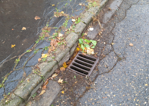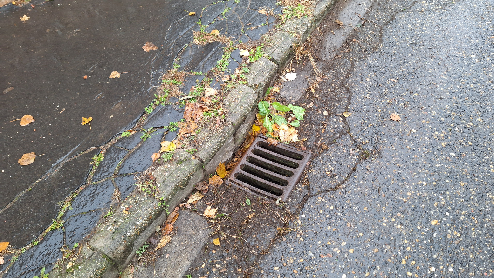 A Vécsey utca 18. előtti csatornanyílás és a járdaszegély között van egy nagy rés.
