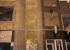 Az Erzsébet híd pesti hídfőjének északi oldalán, a járdán található a képen látható szerkezet, ami talán egy lámpaoszlop alsó része lehet. A szerelőnyílásról hiányzik a burkolat és belül még a biztosítékdoboz fedele is hiányzik. Forgalmas helyen van és balesetveszélyesnek tűnik - kisgyermek által is könnyen elérhető magasságban van és valószínűleg feszültség alatt áll.