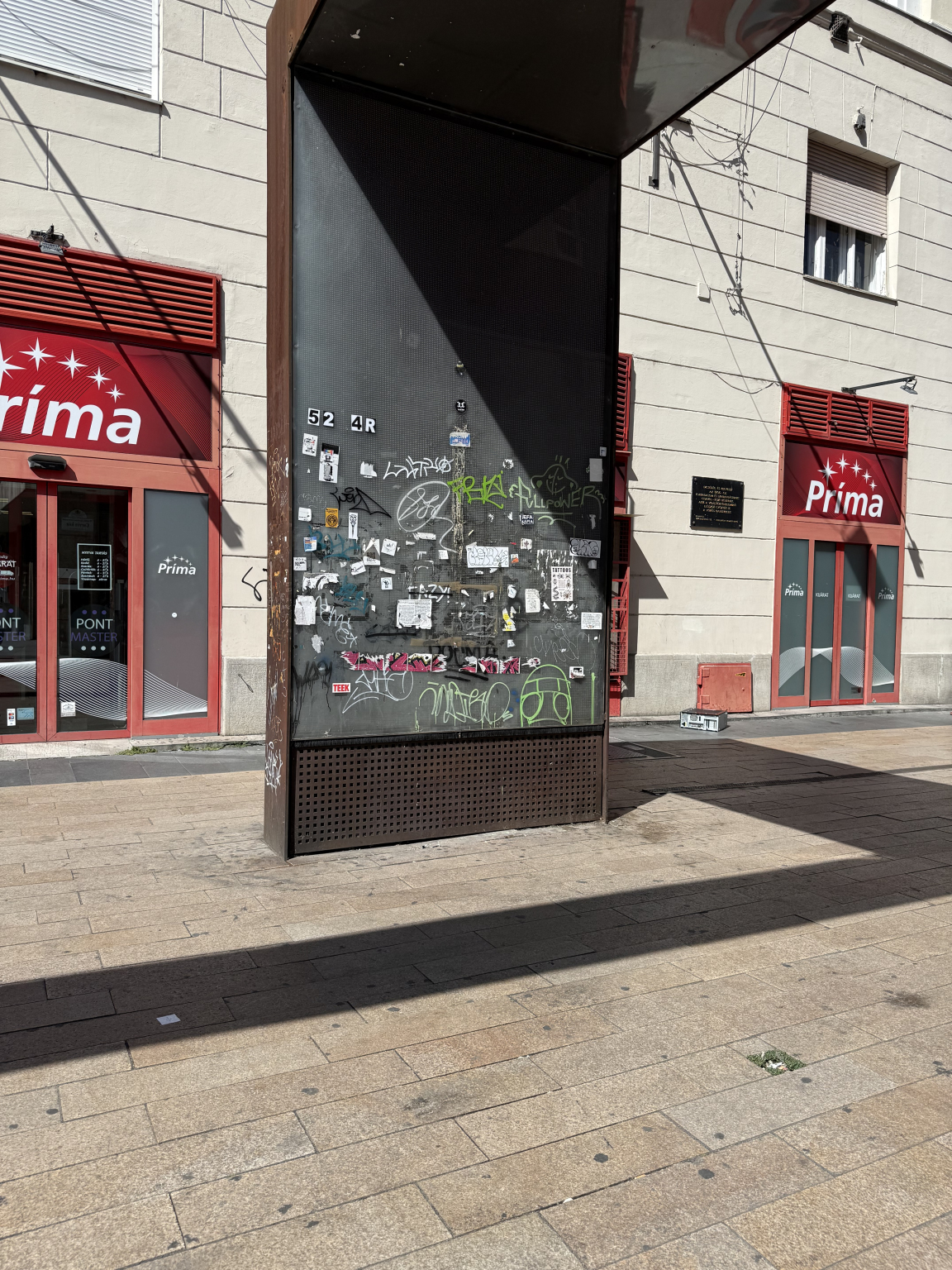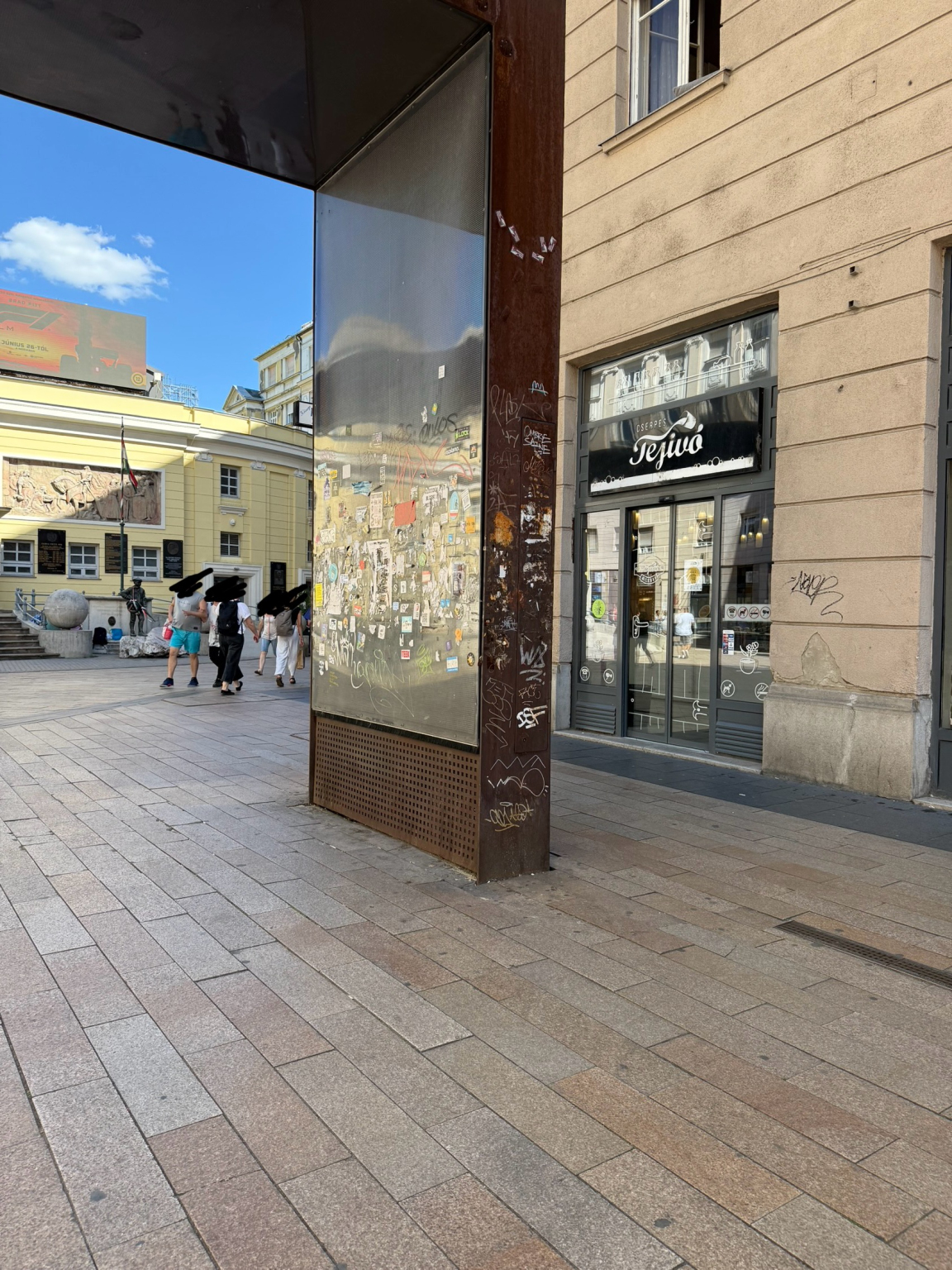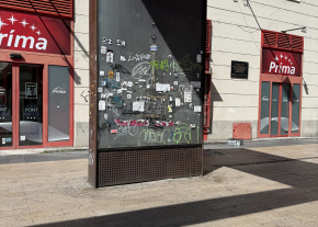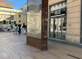 Gondozatlan, nem karban tartott, összefirkált, teliragasztott, rozsdás hirdetőtábla. Mindenki csak elhárítja, mondván nem az övé ez az építmény, de valaki csak engedélyt adott valakinek a megépítésére, de évek óta egyre igénytelenebbül néz ki. Ideje lenne letakarítani, korábban még működött a bele épített ledfal, de ma már azok sem üzemelnek. Ha nem működik és nem foglalkozik vele senki, akkor el kell bontani, hogy ne rontsa a városképet.
