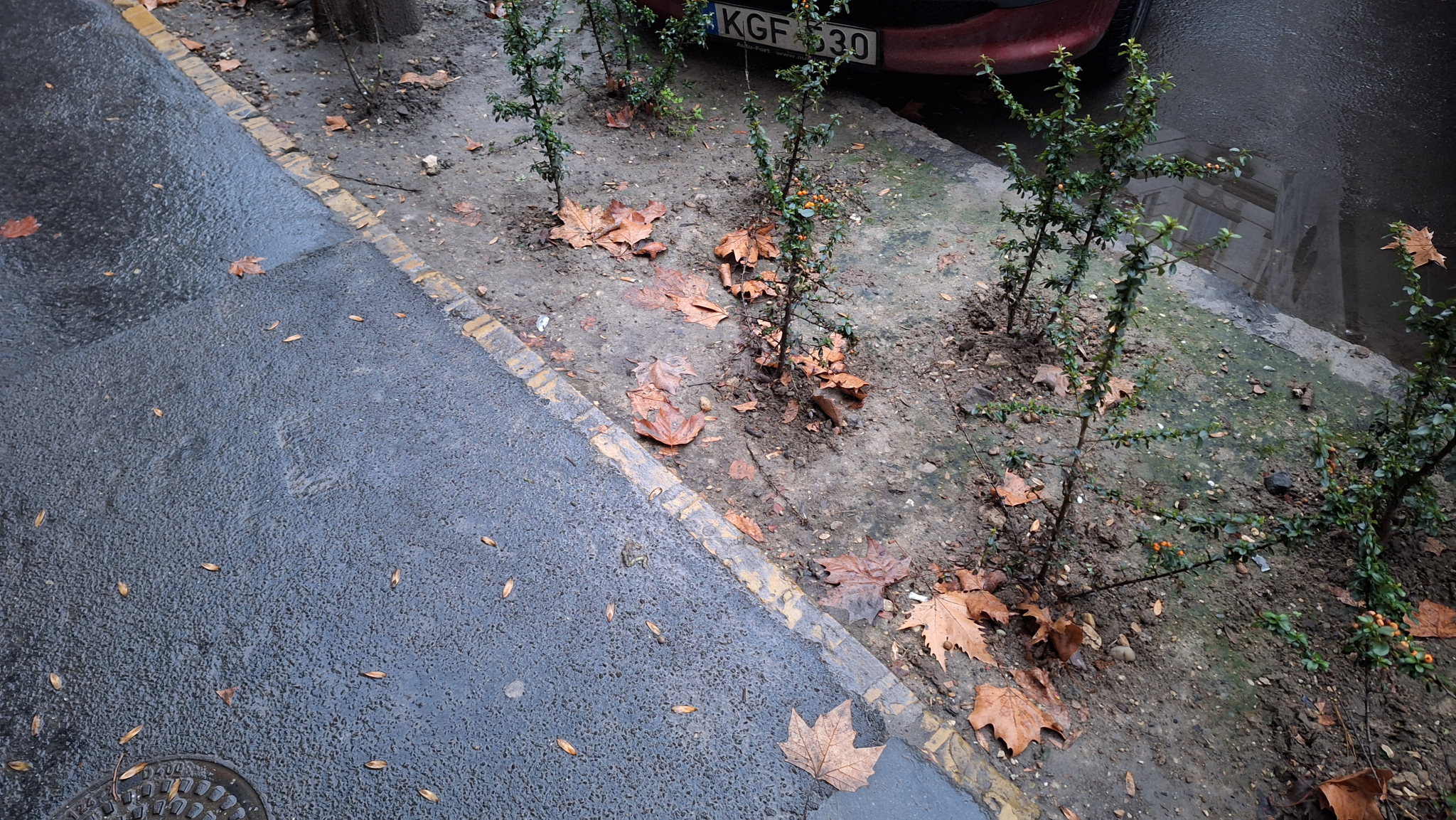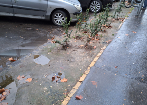 A járda szegélyköve beszakadt, az alatta lévő üreg jelentős kiterjedésű, a parkoló alá fut be. Félő, hogy a parkoló beszakad egy súlyosabb autó alatt.