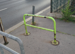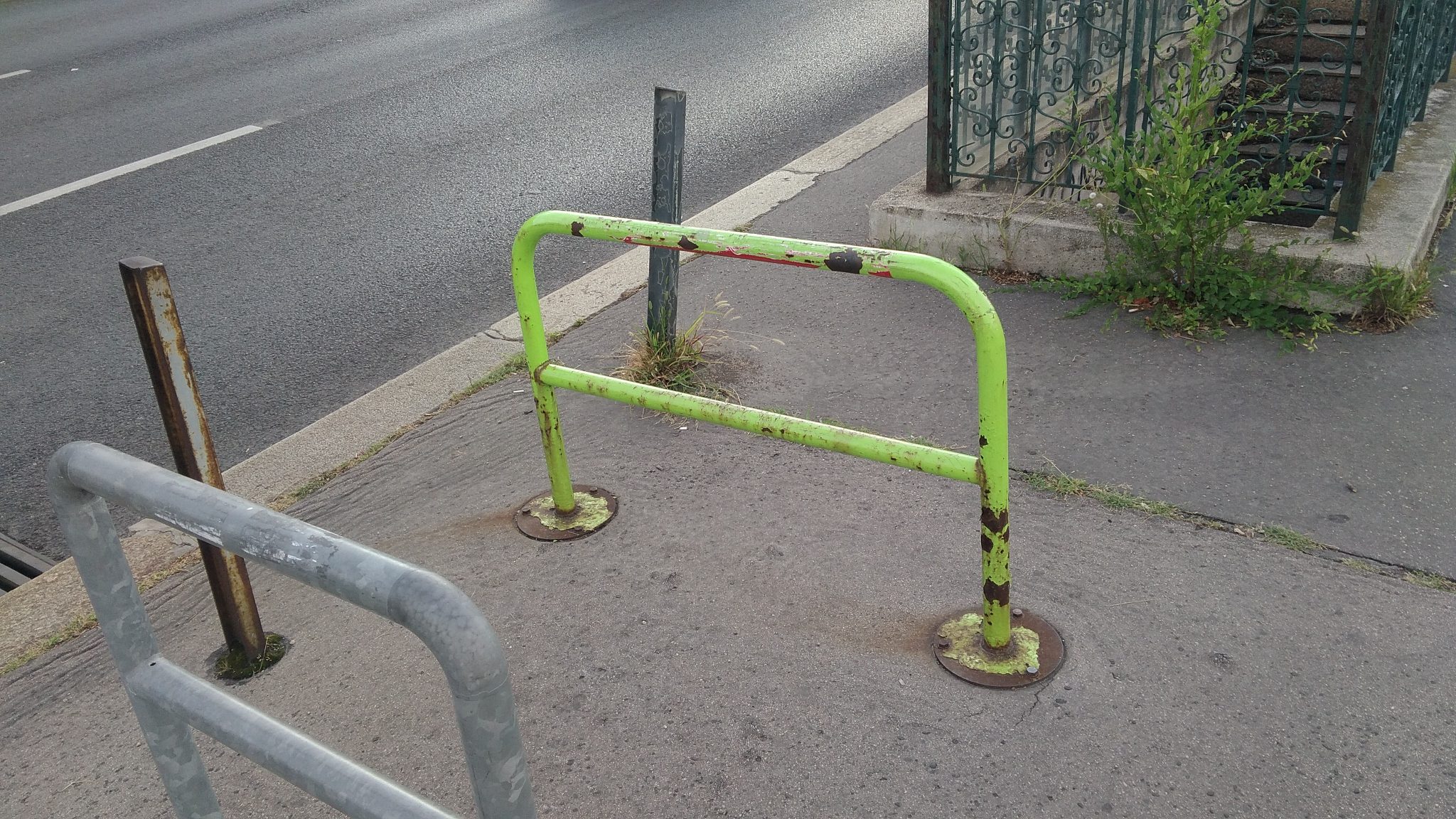 Kérem, cseréljék ki a képen látható egykori MOL-os bicikliparkoló maradékát a mellette lévőkkel megegyező típusúra!