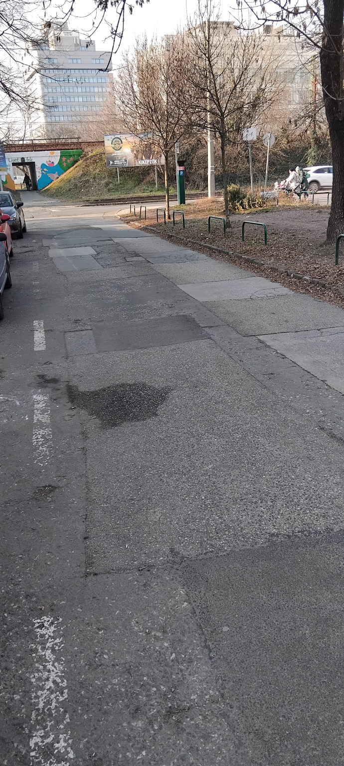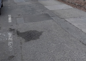 Kátyúk a Budapest, XIV. kerület Korong utca páratlan oldalának elején.