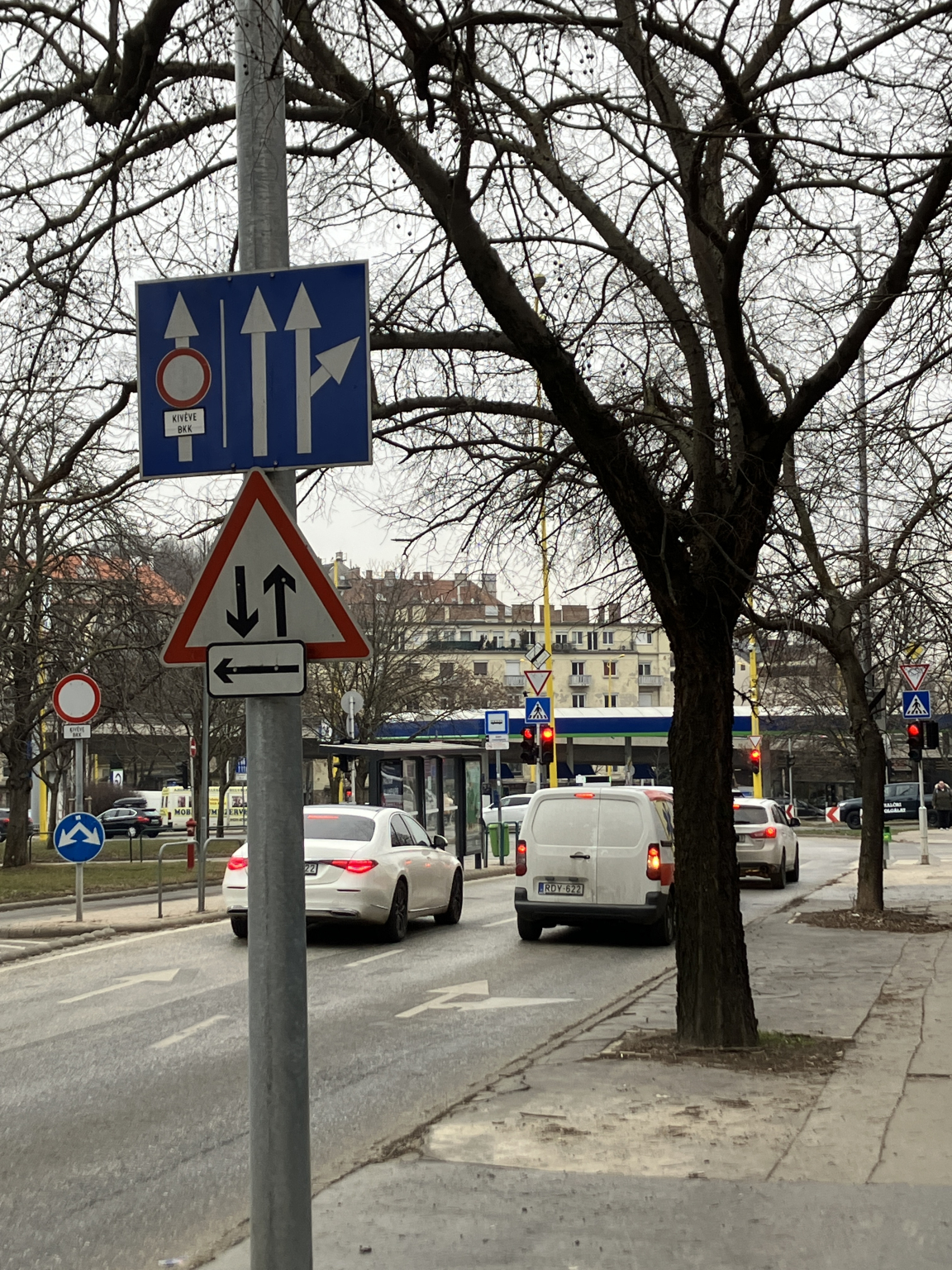 A problémás visszakanyarodó sáv az első kereszteződésbe érkezik, a fenti logika alapján ezért lenne indokolt a BALRA nyíl a visszakanyarodás helyett, hiszen utána kapnak egy újabb BALRA nyilat a második kereszteződésben.