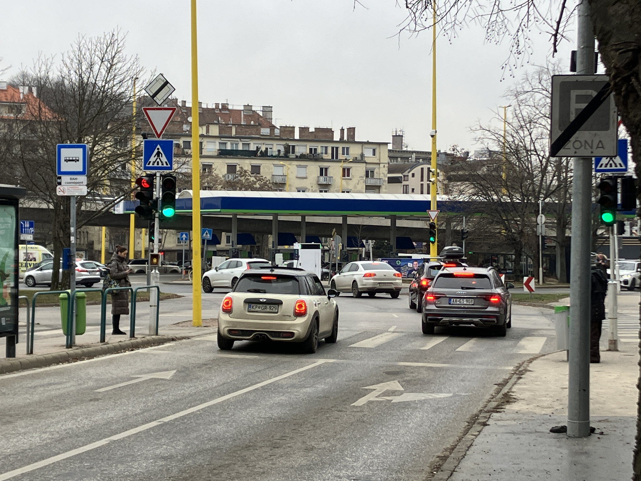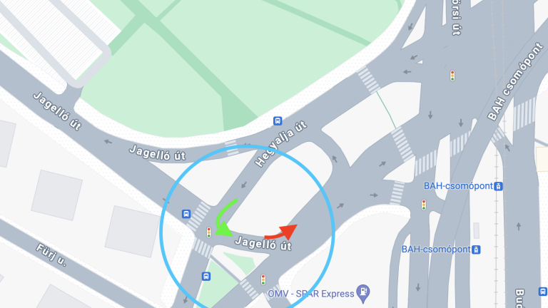 Egy ellentmondásra azonban szeretném felhívni a figyelmet: a Jagelló útról érkezők először ELŐRE kapnak zöldet, majd a következő ponton BALRA. Egyértelműen két külön kereszteződésen haladnak át.