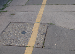 Kopott ELMŰ fedlap a Baranyai tér sarkán, a biciklisávon.