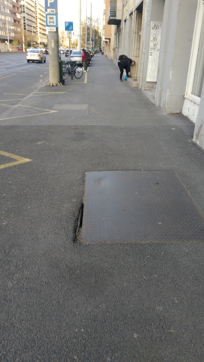 Az Októberhuszonharmadika utcán a Baranyai tér közelében az ismeretlen fém fedlap kissé megsüllyedt, és a süllyedt részéhez lépve még mozog is.