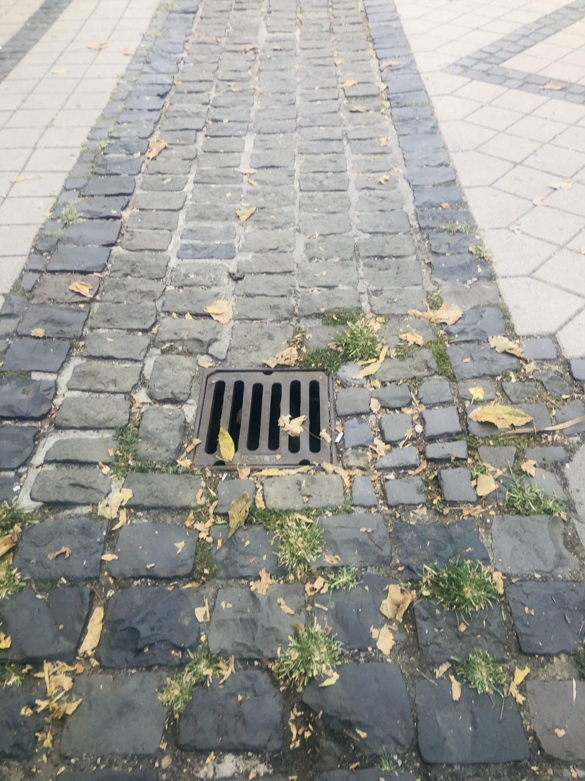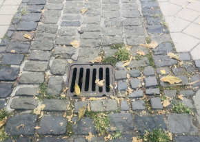 Egy macskakő hiányzik a víznyelőnél a sétálóutca elején.
