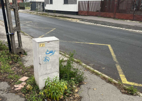 Elhanyagolt E.ON szekrény és oszlop környezete , a kettő összekötésénél nem lett helyreállítva a burkolat ezért kigazosodott.