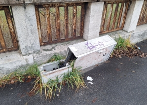 Töredezett Trafficom fedlap a Greguss utcában.