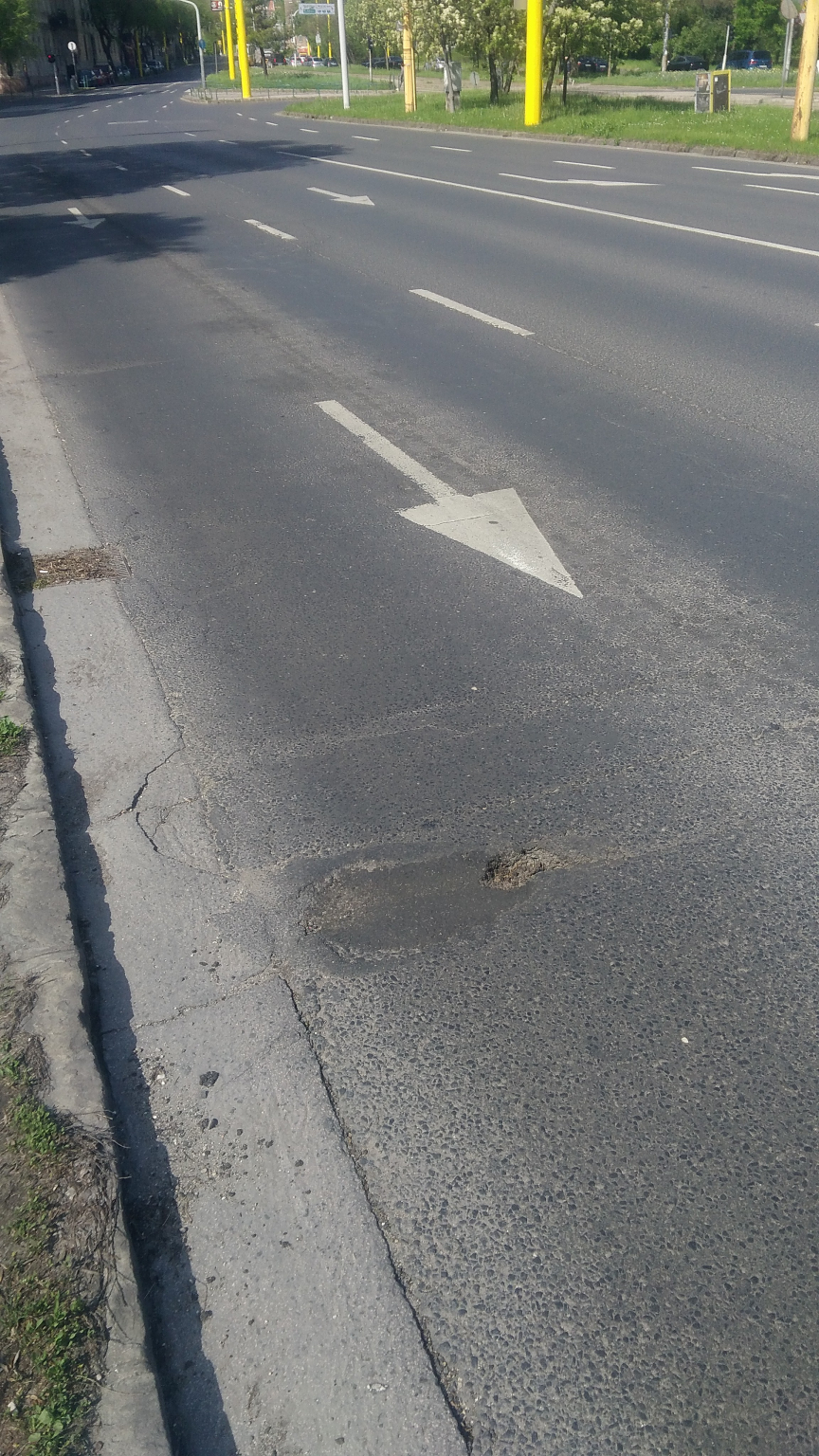Kérem, tömjék be a képen látható kátyút! A Déli pályaudvarnál, a Széll Kálmán felől érkező sávok burkolatán található.