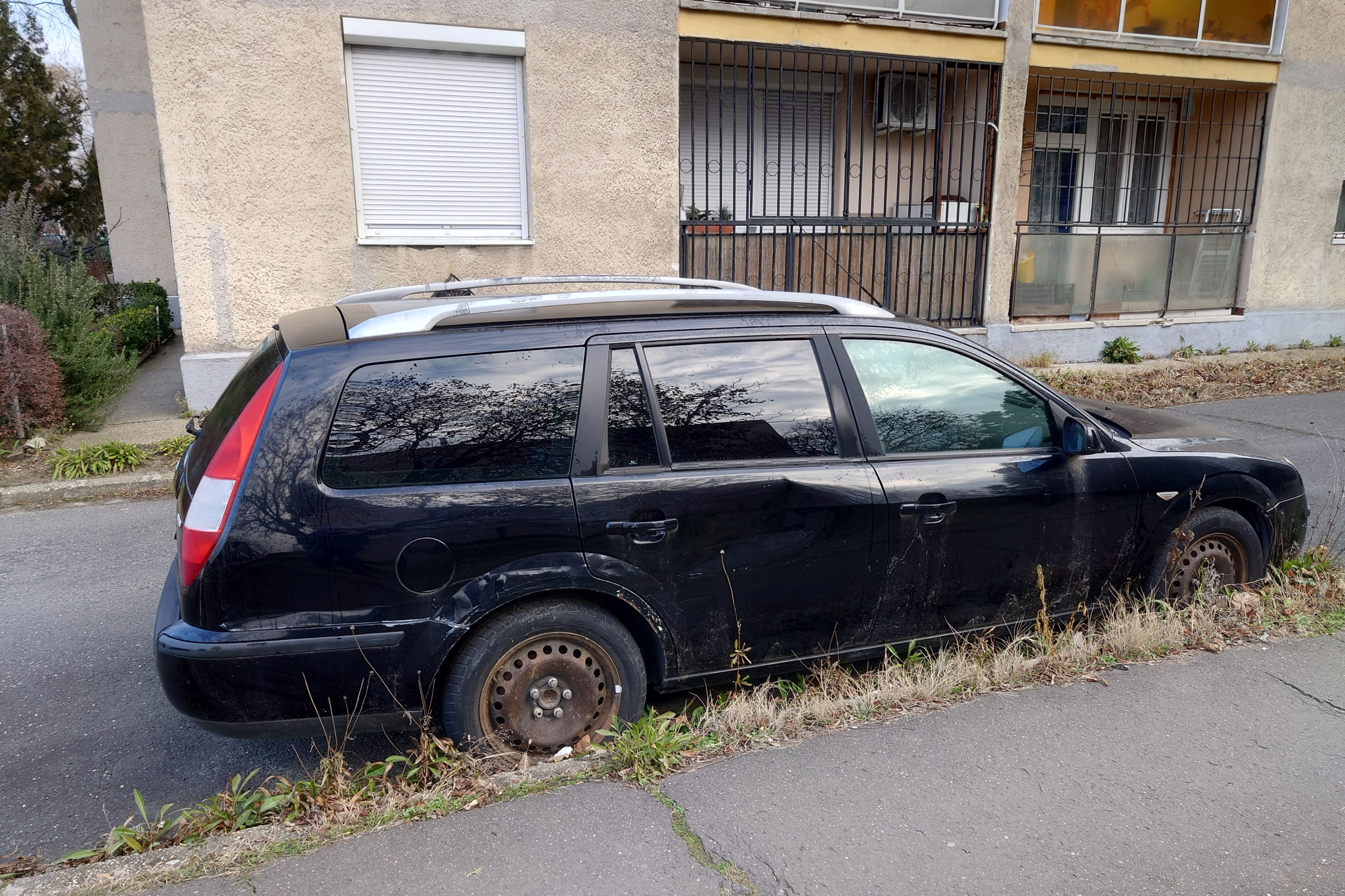Két éve ki van vonva a forgalomból, lepusztult állapotban foglalja a parkolóhelyet.