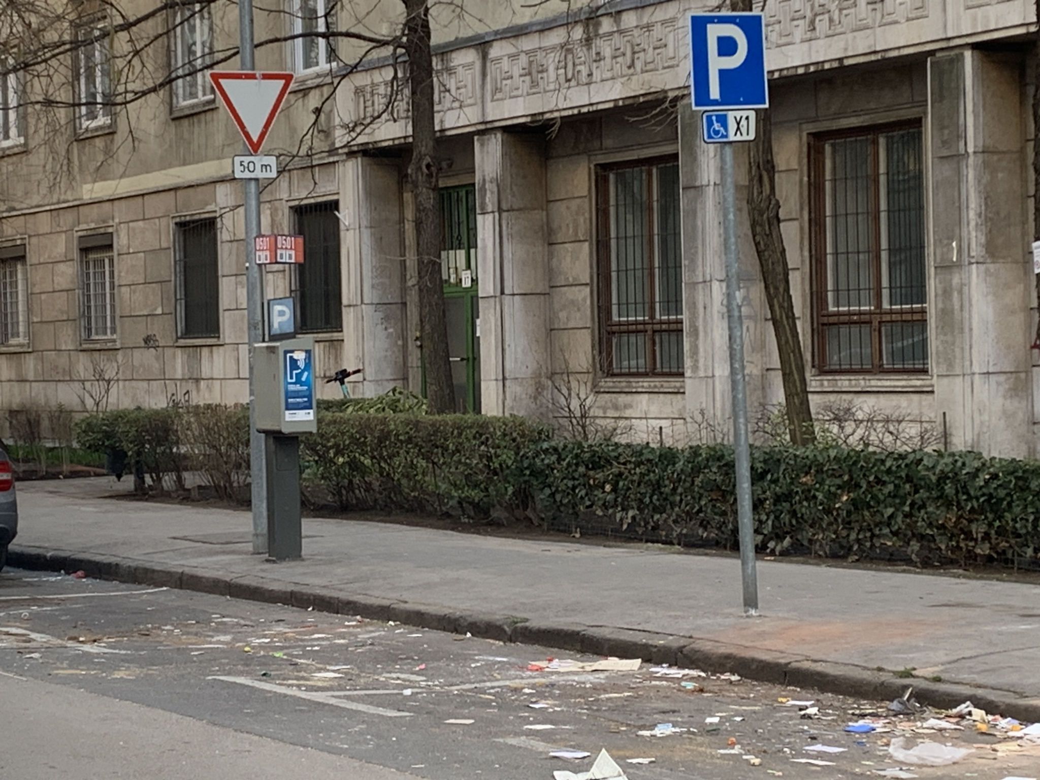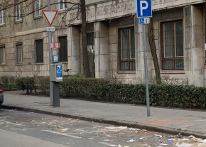Jelzett helyszínen, a kijelölt mozgássérült parkolót jelző tábla elfordult, a speciális felfestés lekopott. A burkolat állapota is töredezett, egyenetlen.