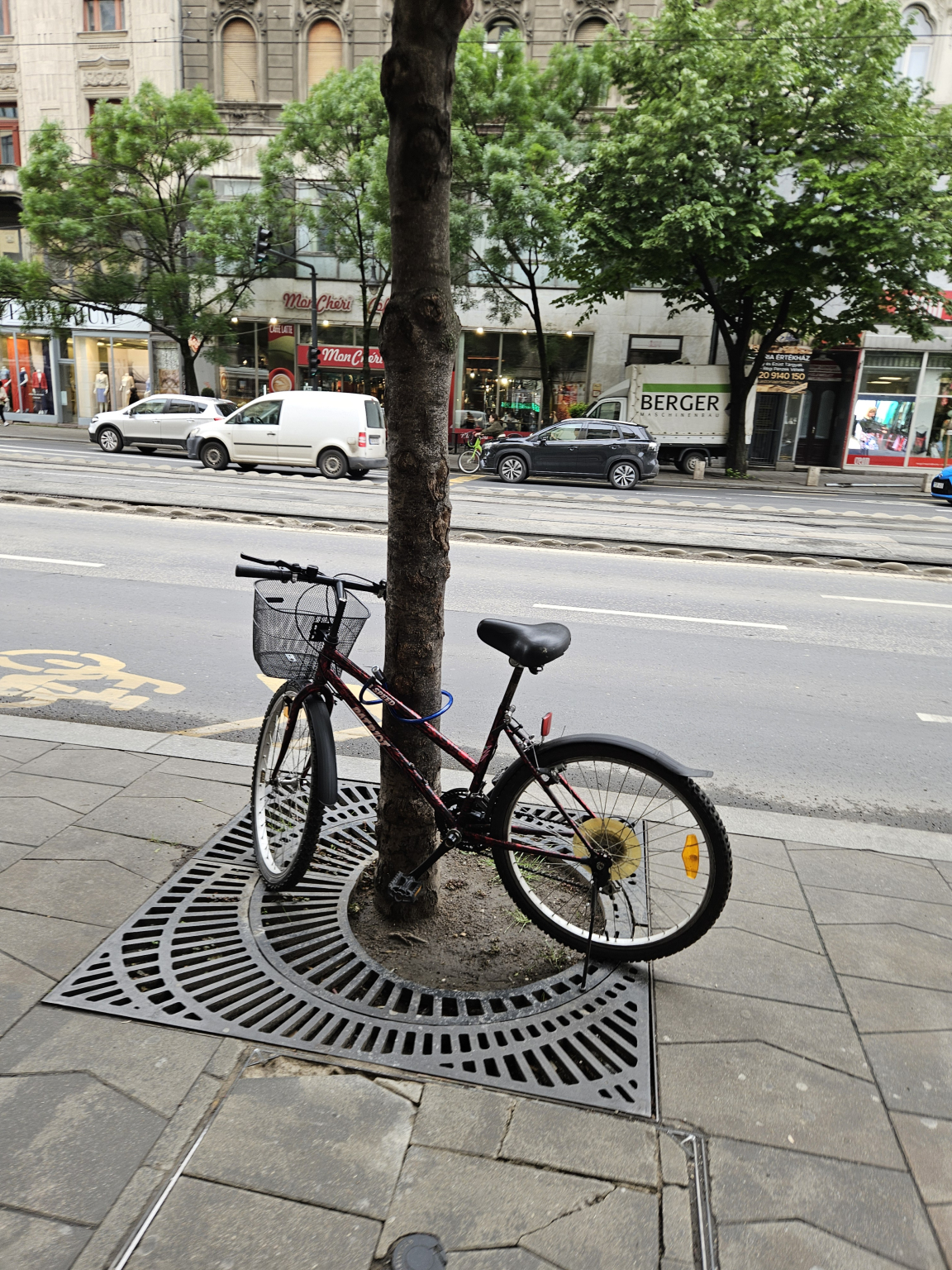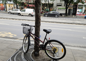 A Károly körúton a kerékpárosok a fákat kerékpártámasznak használják. Ez nemcsak a gyalogos forgalmat akadályozza, hanem a fáknak sem tesz jót.