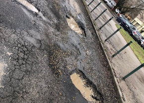 A Lőrinci úton haladva is és a Tisza István utcából ki-és behajtva is pont az autó keréknyomában van a csatornafedél közvetlen közelében egy 15 cm mély, kb. 1 méter átmérőjű kátyú.