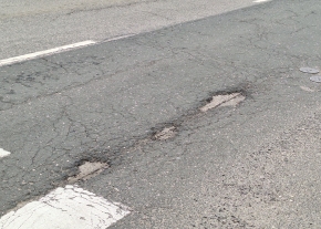 A betonjárda és a föld határán több mély kátyús gödör van.