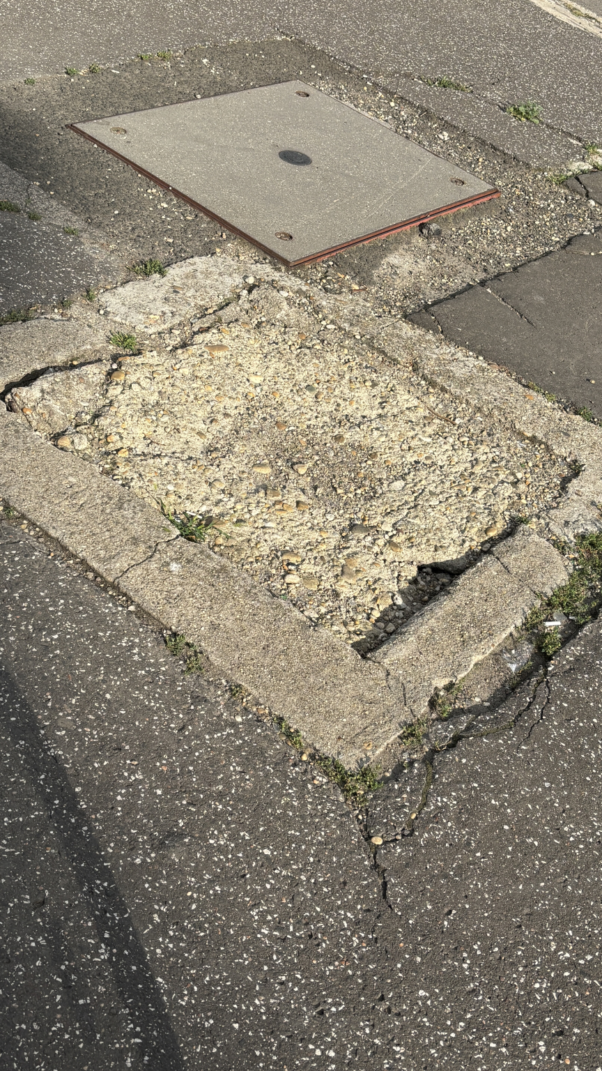 Google alapján már 13+ éve sérült. Nem sikerült rájönni mi volt ott, vagy mi van alatta. Szerintem nem közmű, inkább régi bódé vagy parkolóóra féleség lehetett.
