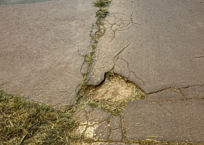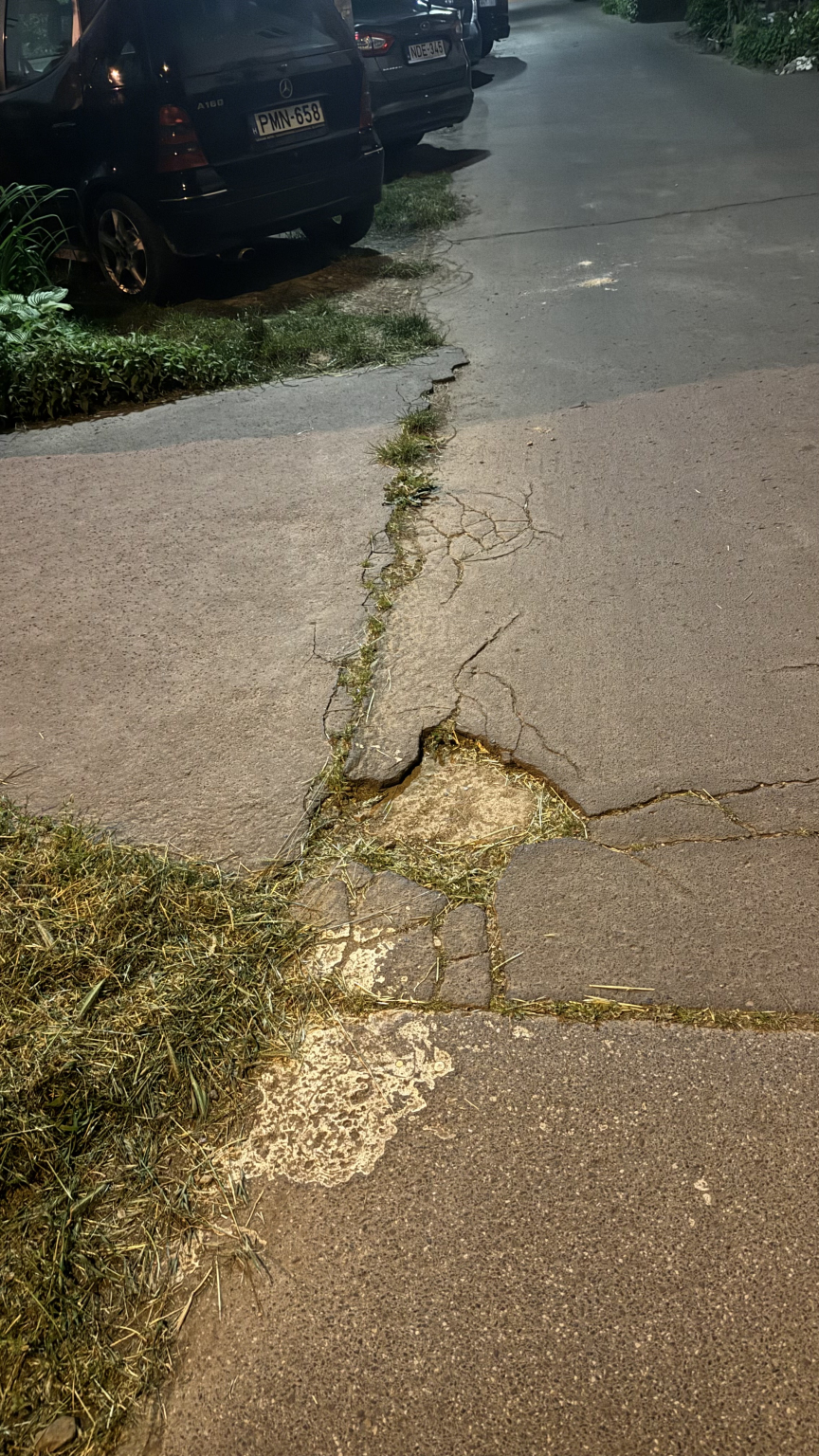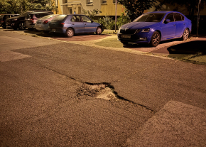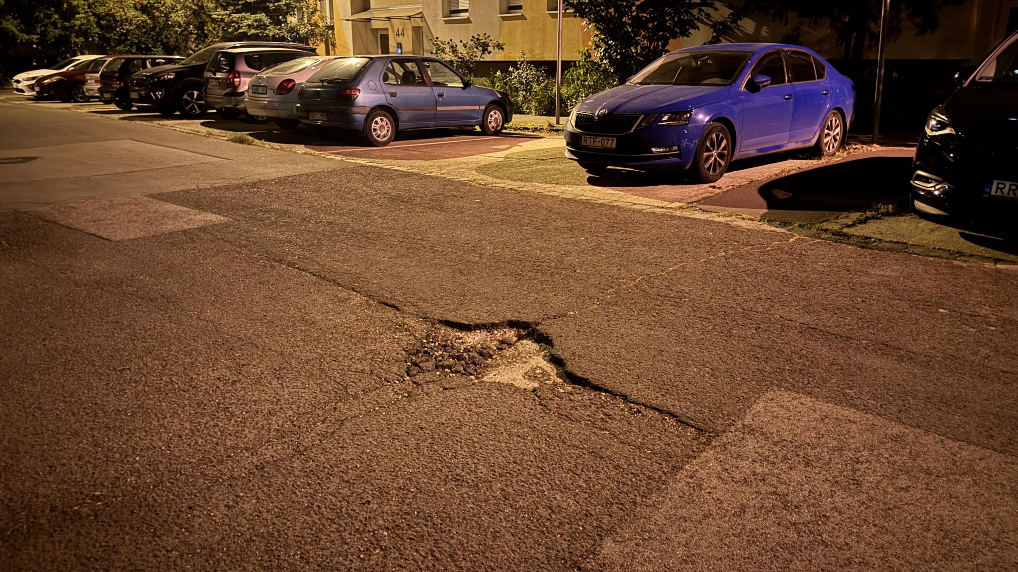 „Tisztelt Járókelő! Tájékoztatjuk, hogy a Juhász Gyula utca 38. számú ingatlan környezetében található úthibák javításáról kizárólag önkormányzati forrás függvényében áll módunkban intézkedni.