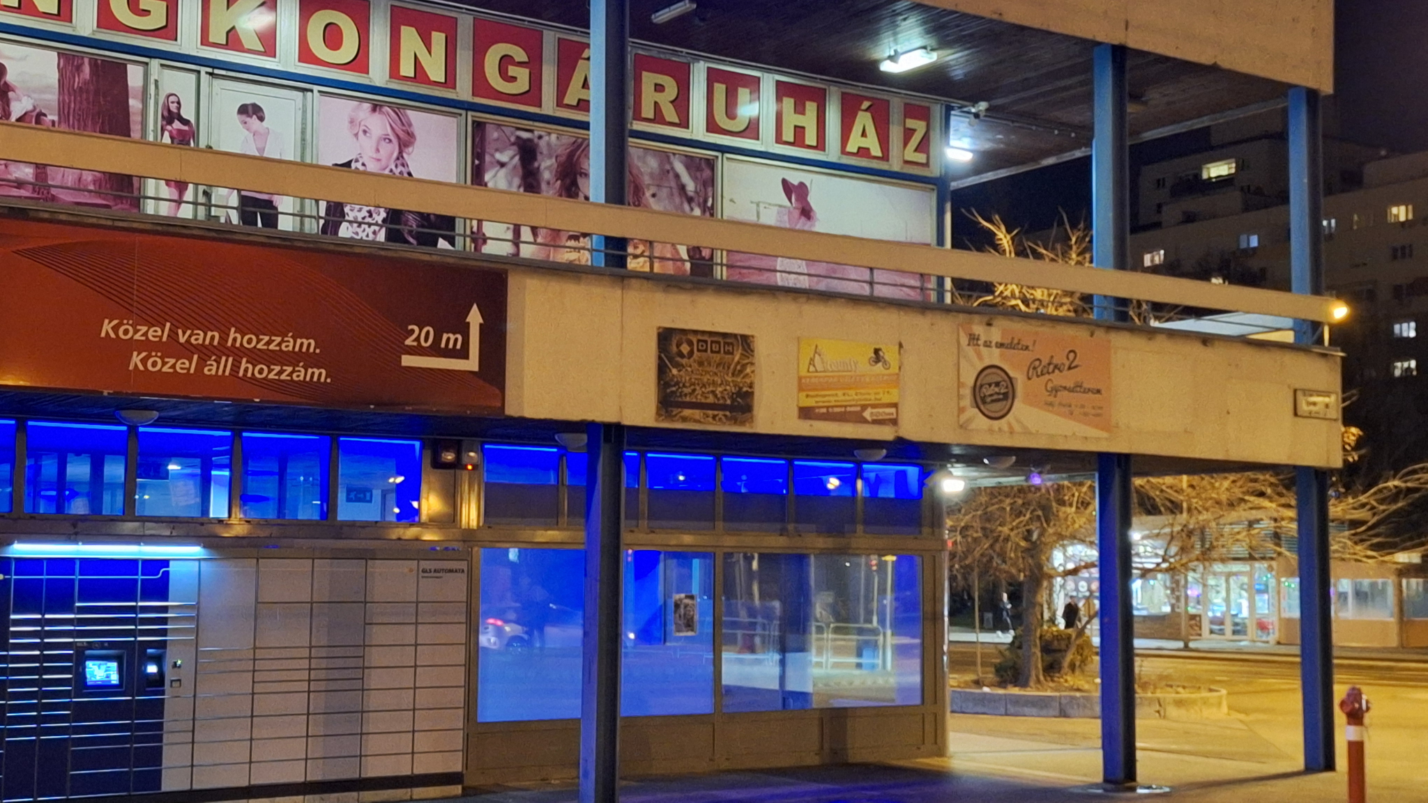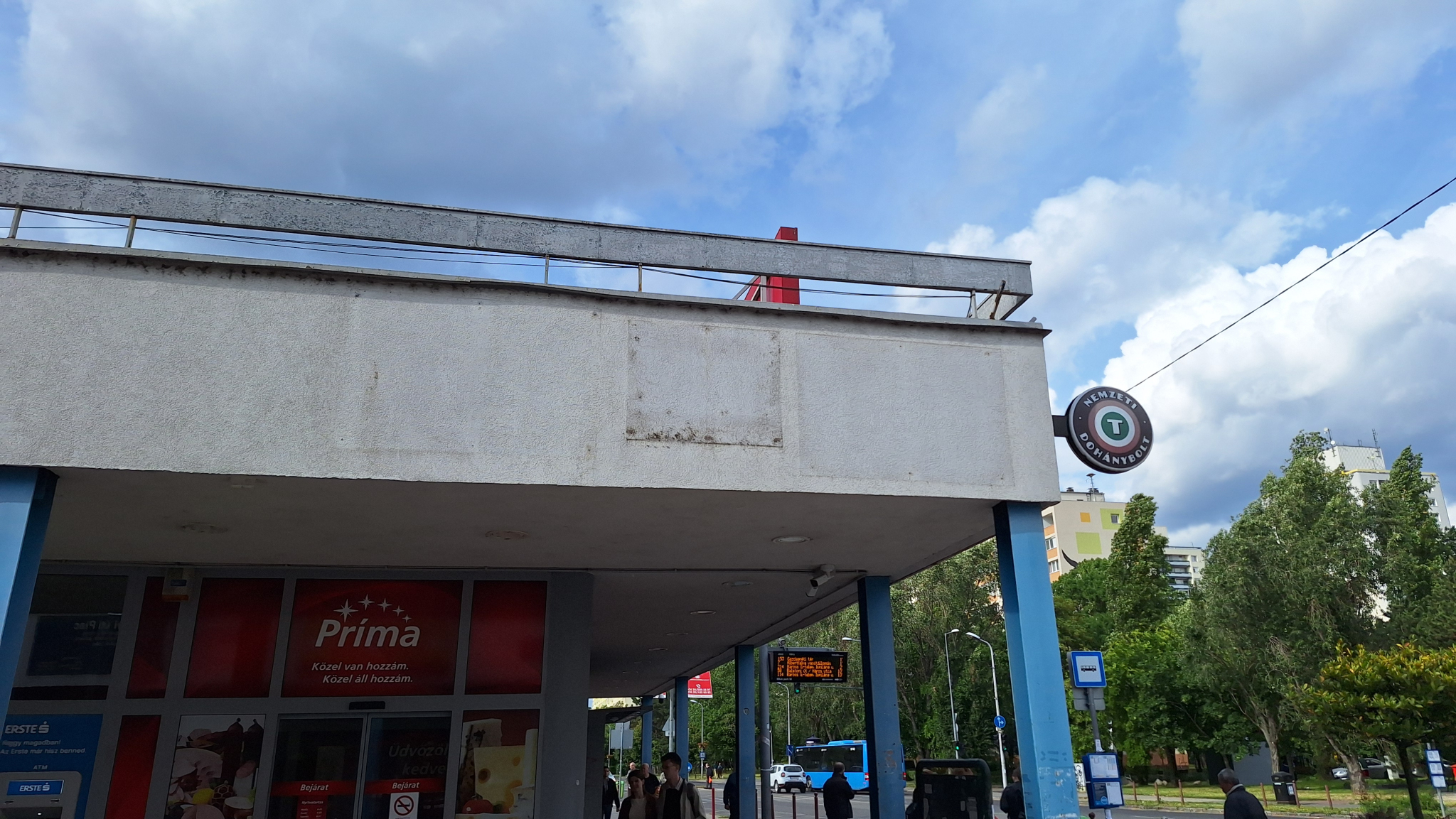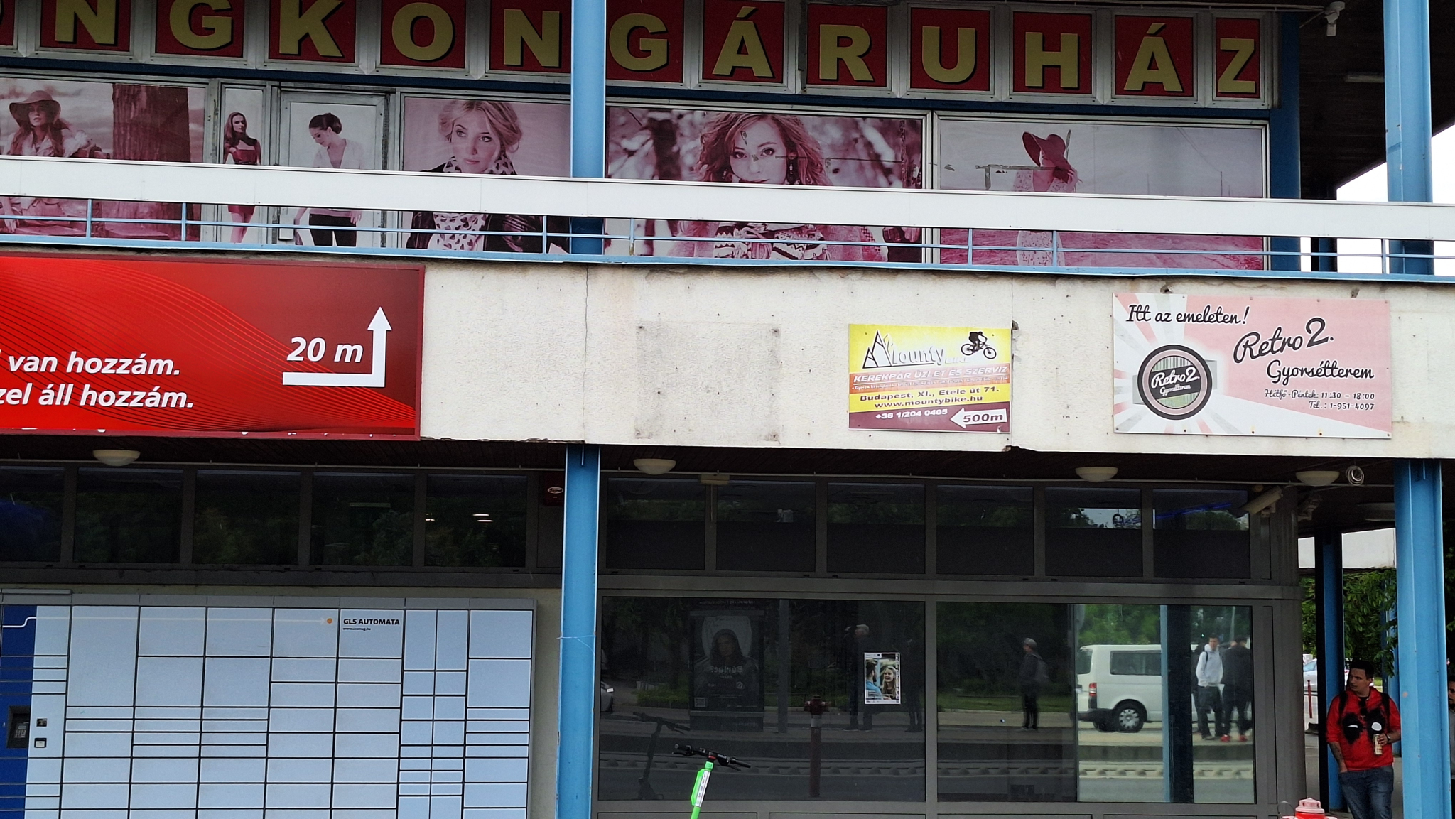 A Tétényi úti üzletközpont homlokzatán több bebarnult, illetve kifakult tábla van. A teljesen fehérre fakult tábla a Google térkép alapján egyébként a Tétényi úti piac nyitvatartását közölte.