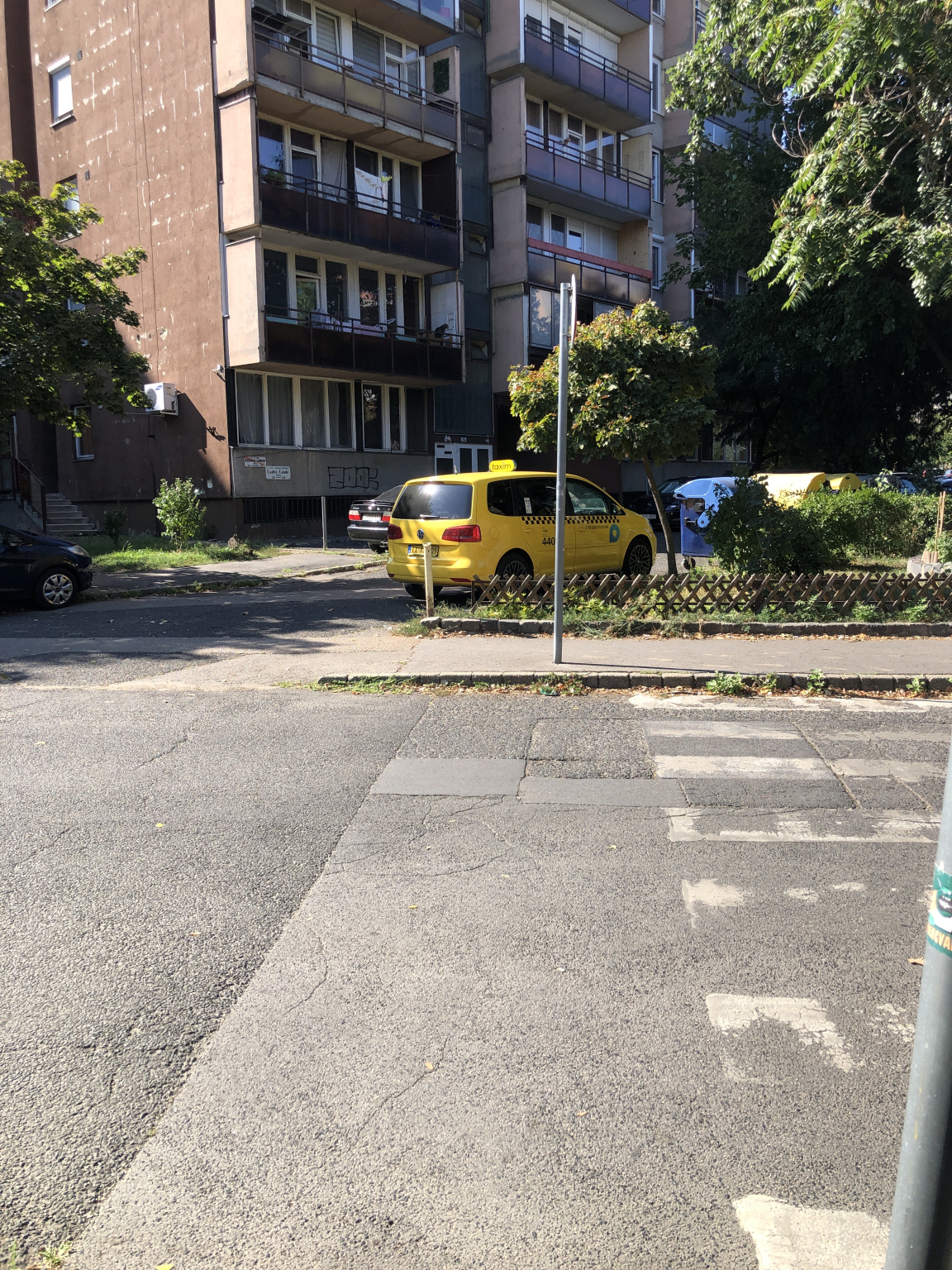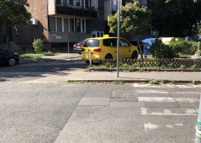 A Lajtha László - János utca sarkához közel egy tábla eléggé ferde.