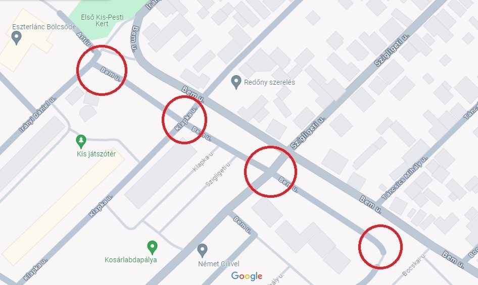 A 19. kerületi Bem utca lakótelepi szakaszán (Bem u. 1. - 37.) és a környékén rendszeres a szabálytalan parkolás, kereszteződésben, járdán, zöldterületen, megállni tilos / várakozni tilos táblánál. Főleg az este 6 és reggel 8 közötti időszak érintett. A kereszteződésekben való megállás különösen problémás, mert ezen a szakaszon összesen 5 iskola, óvoda, bölcsőde található, nagy a gyerekforgalom, a szabálytalanul parkoló autók miatt a kereszteződések beláthatatlanok, balesetveszélyesek. A fotók között csatolom térképen bekarikázva a legproblémásabb részeket. Kérem legyenek szívesek rendszeresen ellenőrizni az ezeket a részeket, lehetőség szerint a kora reggeli órákban, hiszen a probléma ekkor a legsúlyosabb.