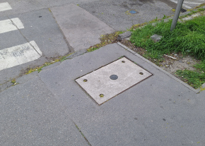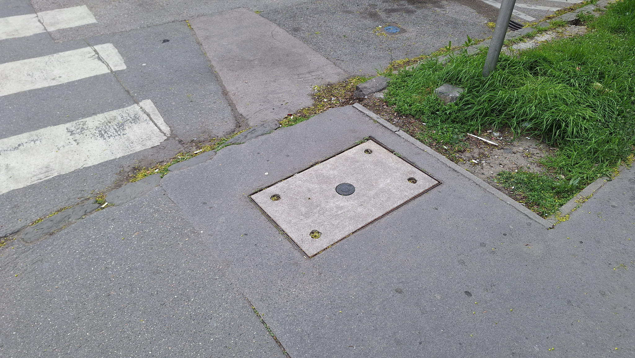 A Fogarasi út 10. előtti aknafedél erősen porladt állapotban van.