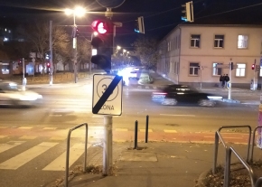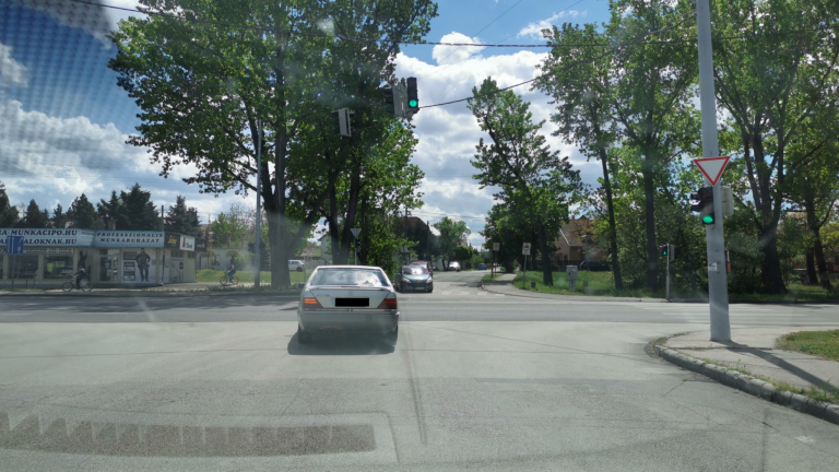 A Pesti út – 509. utca kereszteződésben az üzletházak felöli kihajtónál a jelzőlámpa előtt széles...