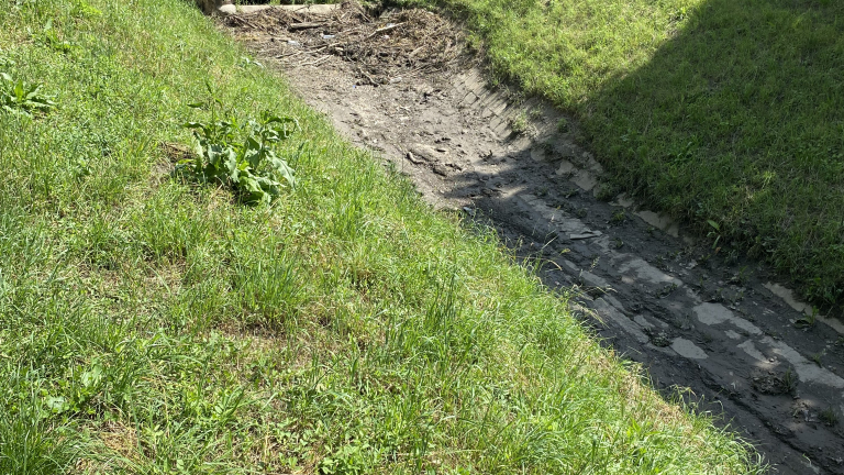 A jelzett helyszínen az árok medre megint csak tele van zöldhulladékkal és szeméttel. A kotyvaszt erjedése miatt ilyenkor kellemetlen szag terjeng.