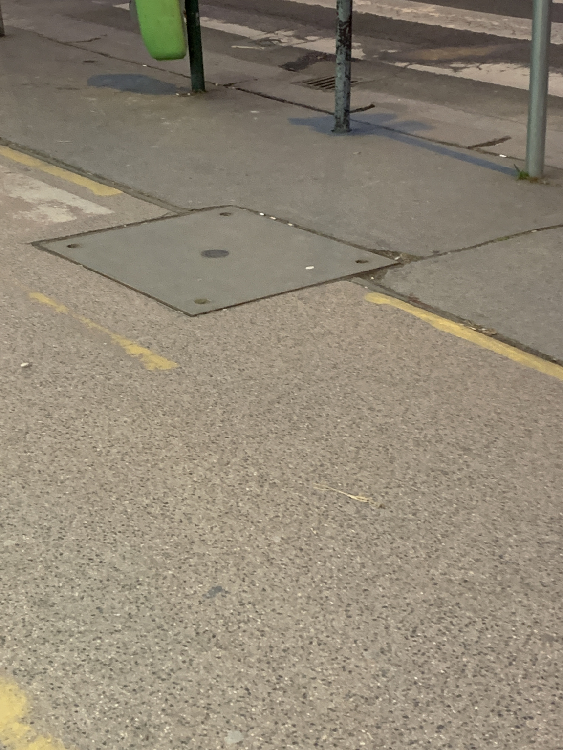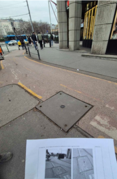 A Deák tér szélén a Bajcsy-Zsilinszky út elején, a bicikliúton lévő fedlap kopott, a közepén a kupak pedig kiáll.