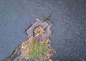 A Vécsey utca 66b. előtti járdán lévő feltételezhetően víziközműtárgyból csomóban nő ki a gaz, talán a sapkája is hiányzik.