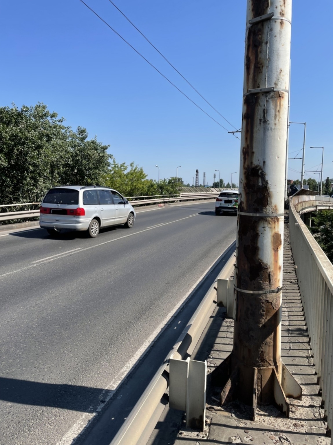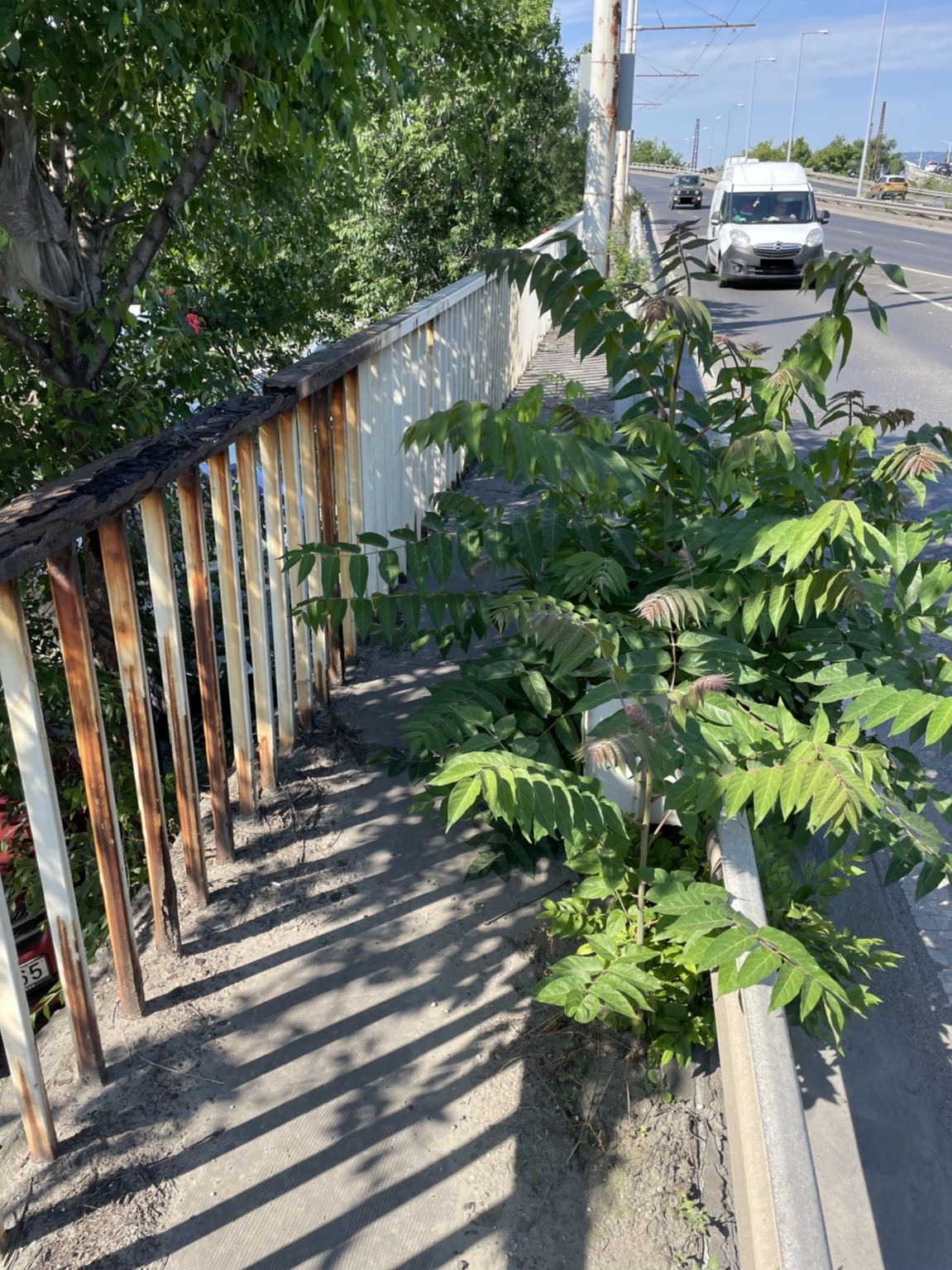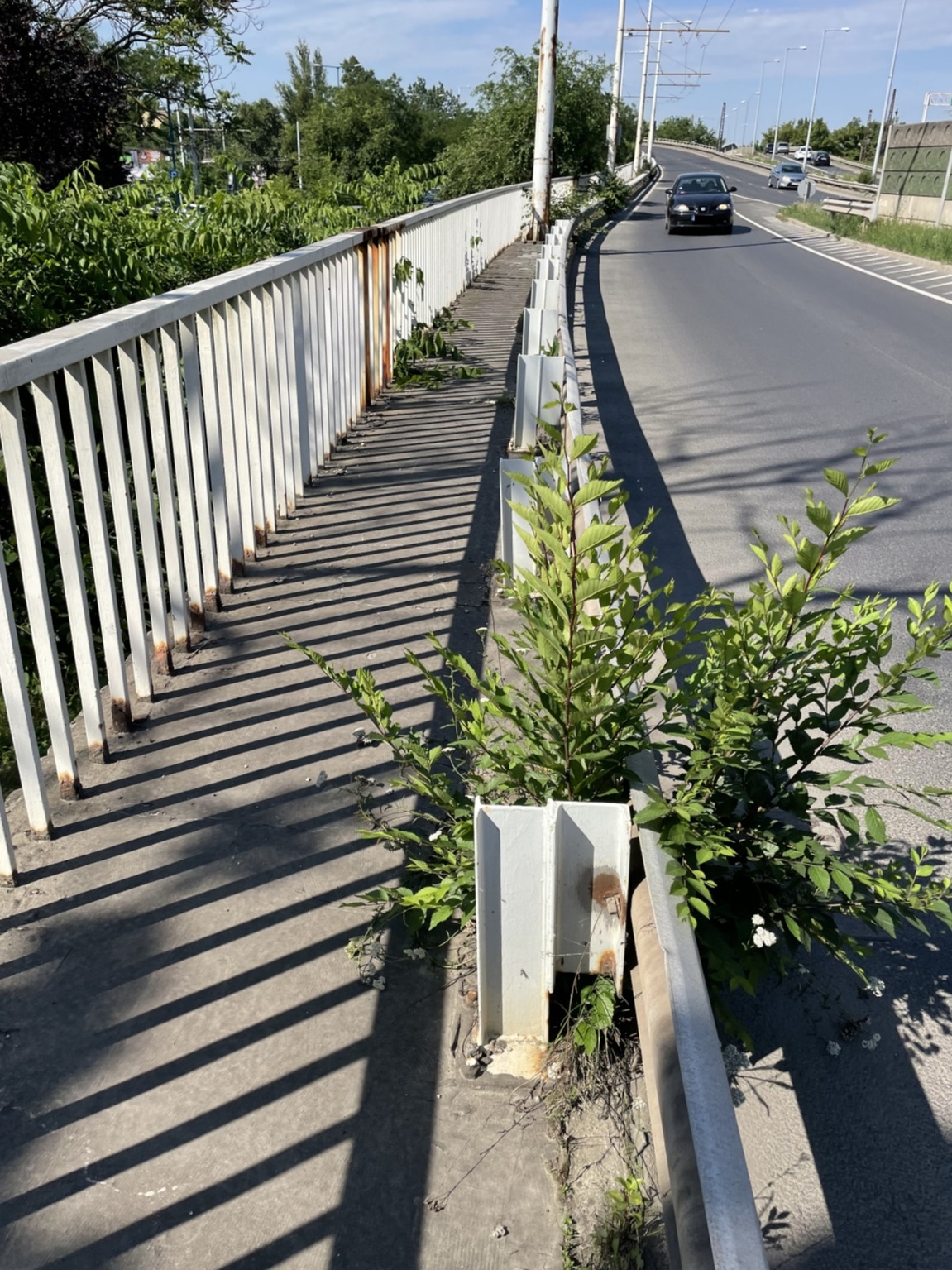 Az oszlopok rozsdásak, rohadnak. A korlátok végig vannak rohadva, hiányosak. Kérdés mikor dől ki. A nincs rá pénz nem igaz, mert sepregetésre, évek óta ott rohadó paplanra volna élőerő, aki összeszedi. A budapestközutas táblát sem a szél fújta oda. A növényeket meg nem szabadna hagyni, hogy teljesen szétnyomják az egészet. A korlát se rohadna, ha időben le lenne festve, így majd tízszer (?) annyiba fog kerülni, mert ez már nem festéssel javítható.