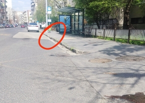 Megsüllyedt burkolat, kiálló szegélykő a buszmegállóban