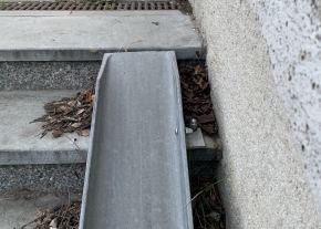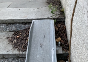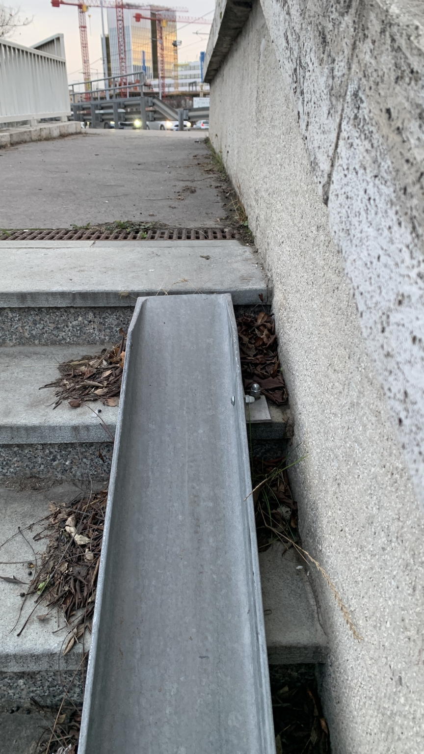 Ragasztva gondolták a két darab 150 kilós rámpa-vasat fölerősíteni a lépcsőre, de szerencsére nem a lépcső kőburkolat-lapjait szakította le, hanem elindult lefelé a rámpa U-vas.
