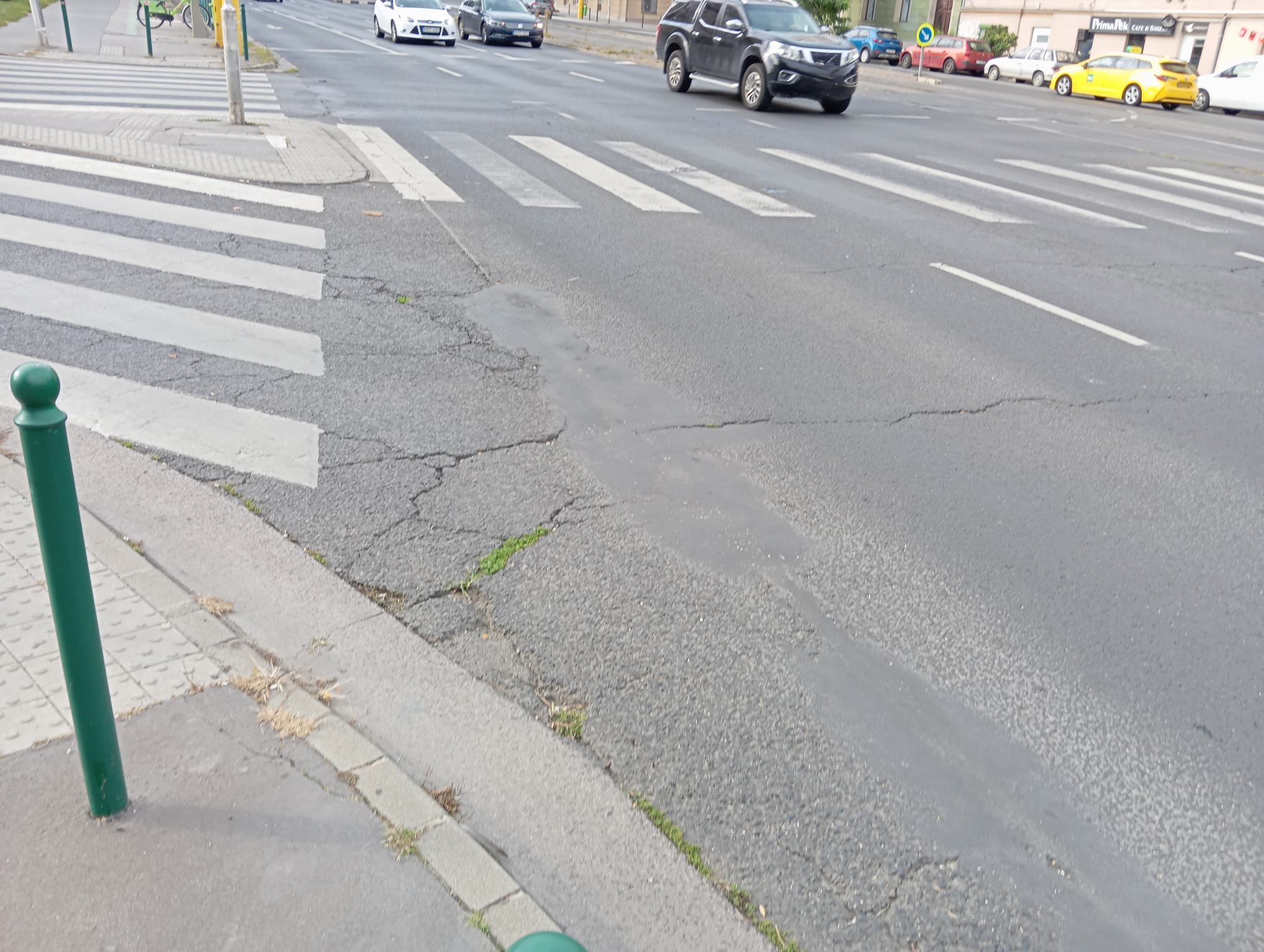 Jelzett helyszínen, az útkereszteződésben rossz állapotú az aszfalt, teljesen töredezett, a korábbi javítások tönkrementek.