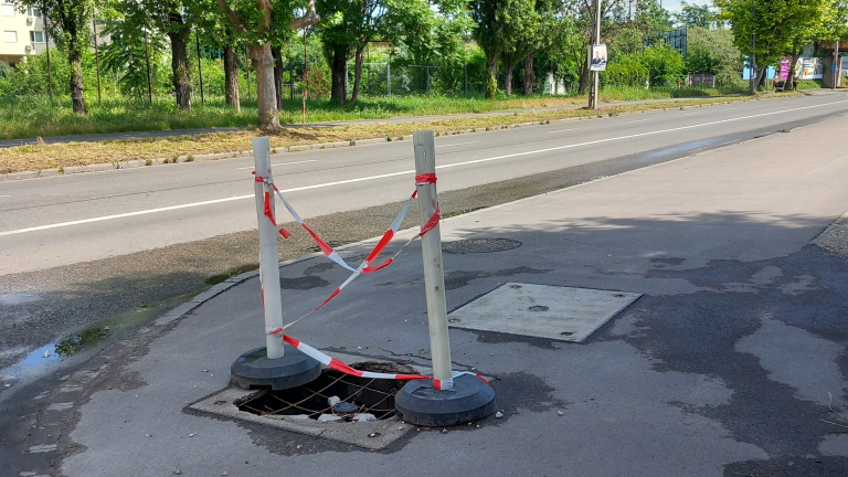 közmű akna hetek óta beszakadva , korláttal körbe kerítve